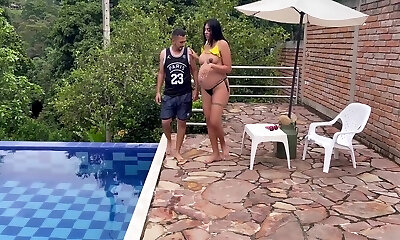 Hot Latina MILF invited her step-son's pal to fuck her lubed bum and tits near a pool