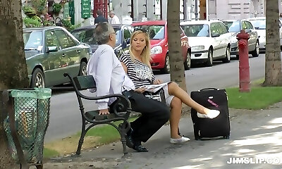 Curvy blond flight attendant gets screwed hard by an older stud